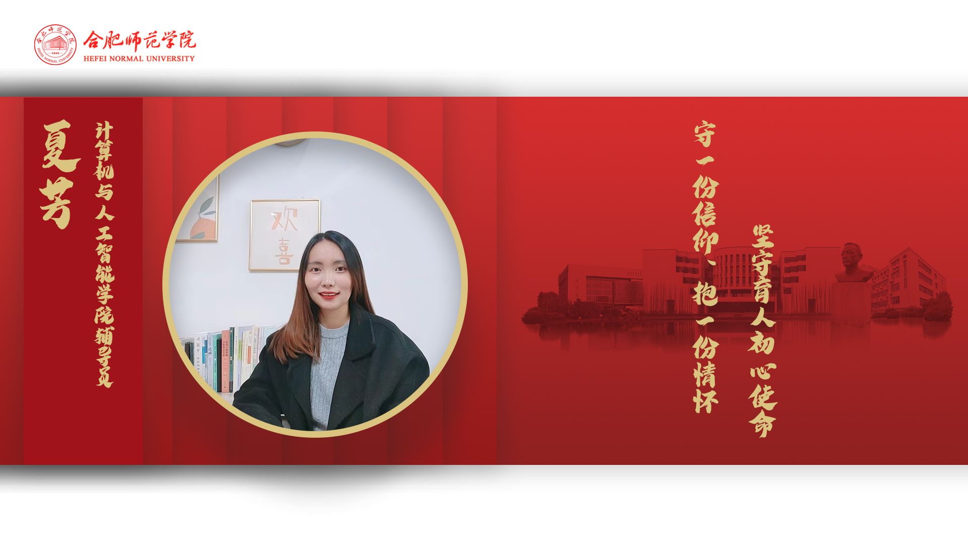 她秉承“有一分光、发一分热”的坚定信念,坚持修己育人,在一丝一毫中教育学生,在一点一滴中改变学生,在一事一情上引导学生,真切关心爱护学生,做青年的助梦人。曾获评为暑期“三下乡”社会实践优秀指导教师,所带宿舍获“十佳优良学风宿舍”称号,发表学生工作学术论文数篇。
